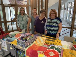 Die Damen der offenen Strick- und Häkelrunde vom „Bündnis Gespür fürs Wir“ boten an einem Stand ihre Waren zu Gunsten der Christrose an.